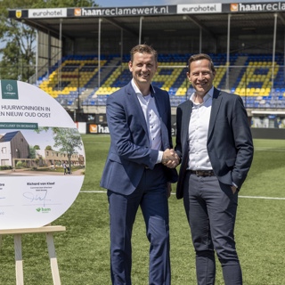 Op donderdag 18 juli ondertekenden wij samen met BAM Wonen het contract voor de realisatie van 50 biobased en natuurinclusieve woningen in de Leeuwarder wijk Nieuw Oud Oost. Op de plek waar Sportclub Cambuur jarenlang haar wedstrijden speelde en trainingen hield, vond de ondertekening plaats op de middenstip.