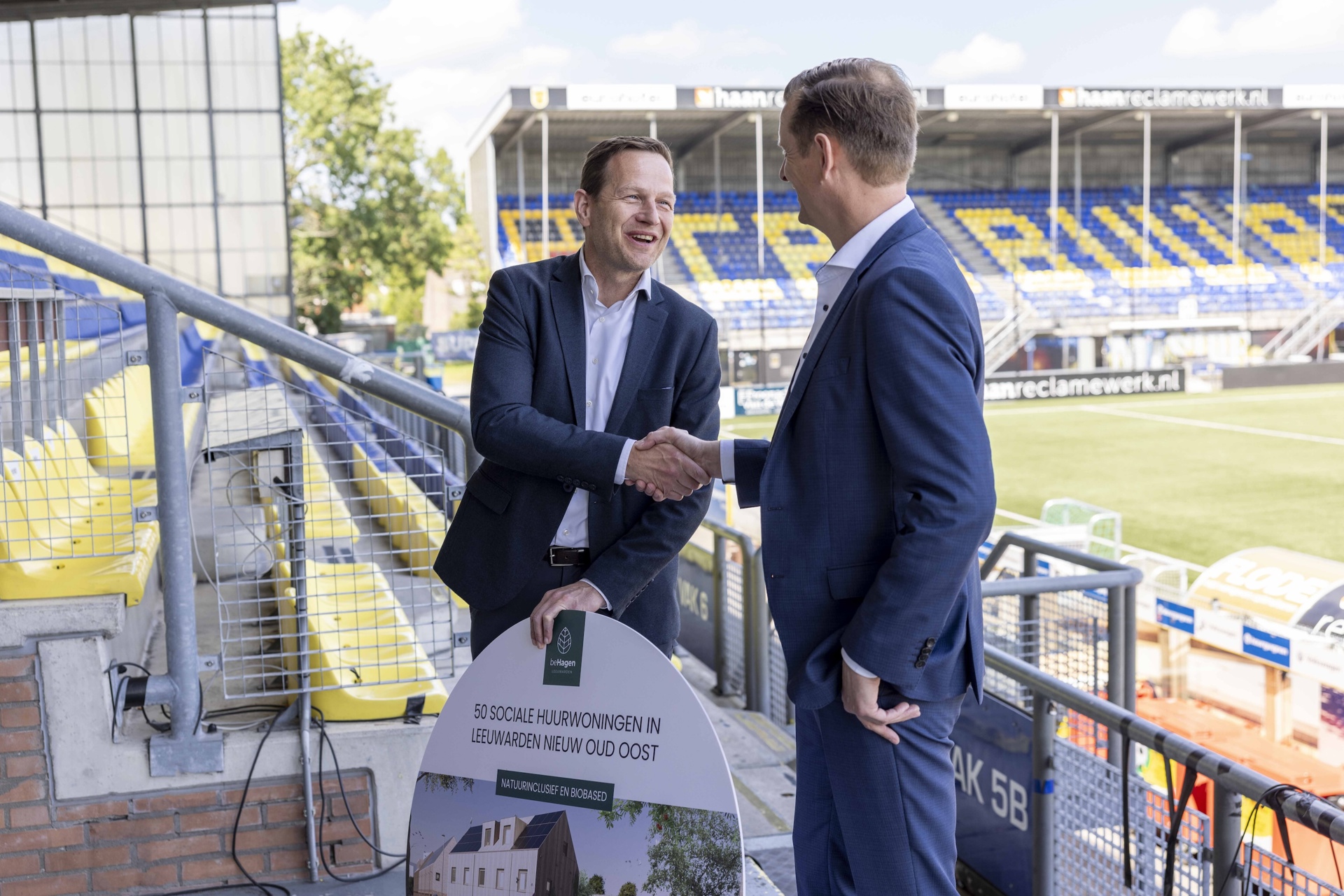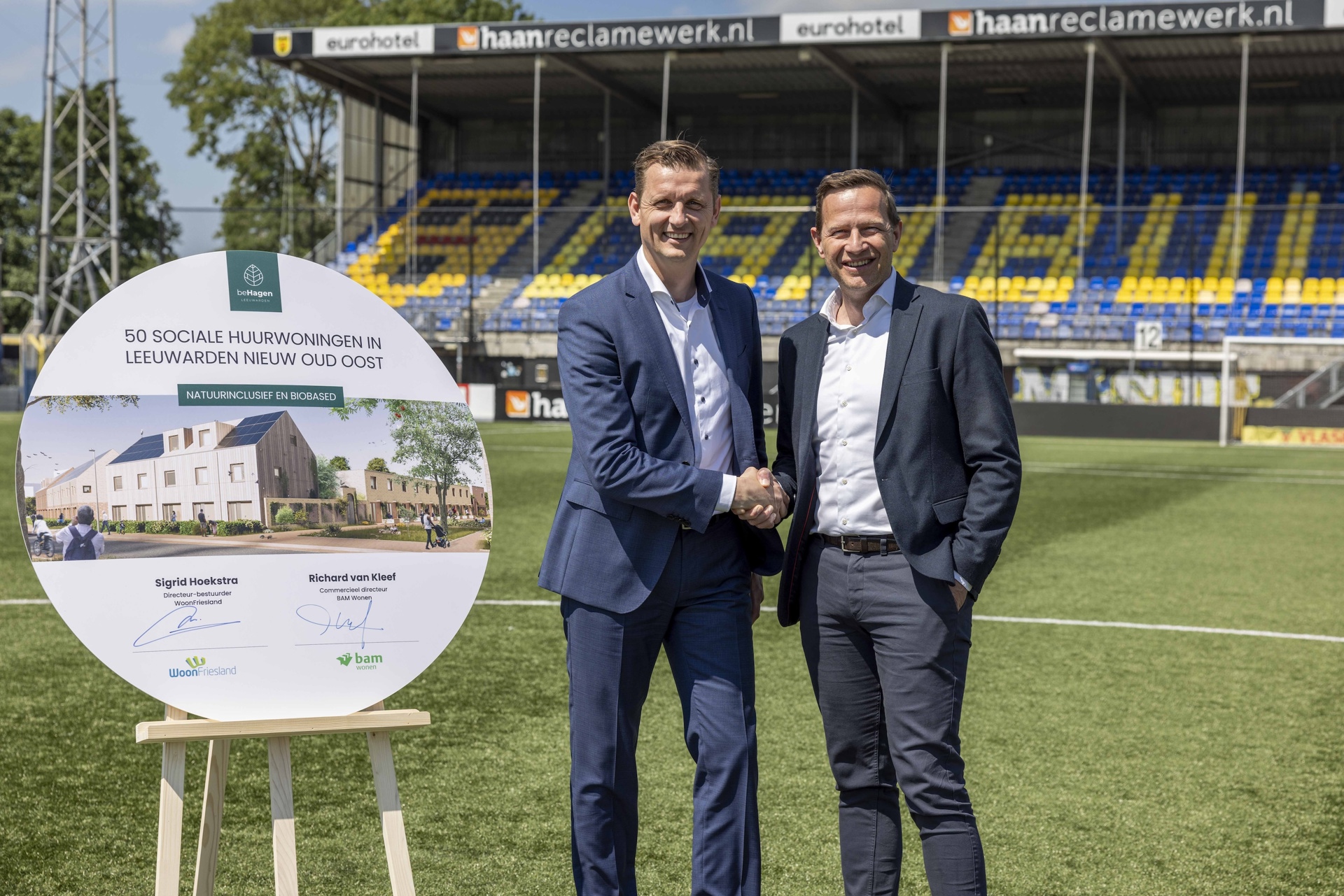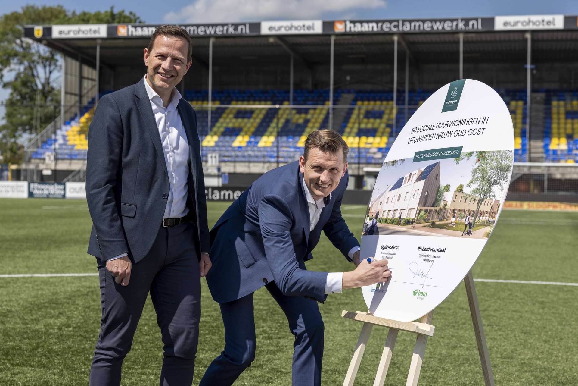 Op donderdag 18 juli ondertekenden wij samen met BAM Wonen het contract voor de realisatie van 50 biobased en natuurinclusieve woningen in de Leeuwarder wijk Nieuw Oud Oost. Op de plek waar Sportclub Cambuur jarenlang haar wedstrijden speelde en trainingen hield, vond de ondertekening plaats op de middenstip.