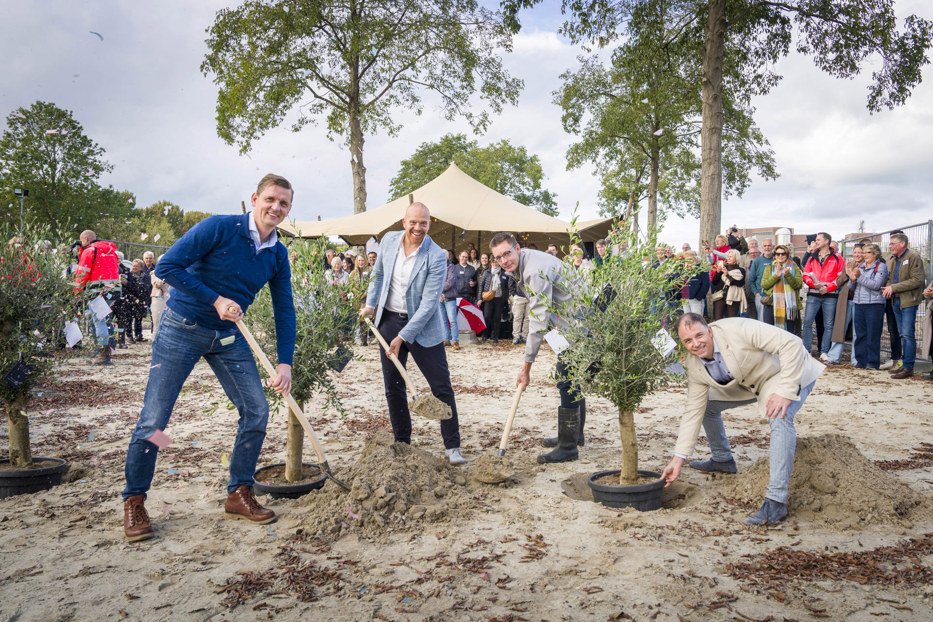 Om de start van de bouw te vieren, plantten we samen met wethouder Hein de Haan van de gemeente Leeuwarden en Arjen Oosting, directeur Van Wijnen Projectontwikkeling Noord, drie bomen. Mix Cammingha wordt namelijk een groene buurt, waar starters, gezinnen en senioren samen prettig kunnen wonen.