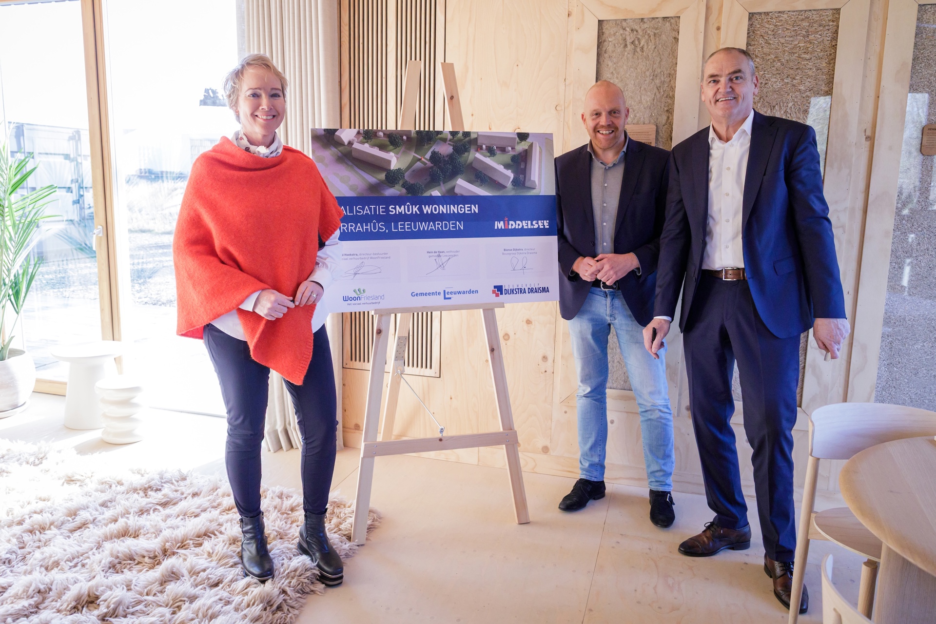 Dat zijn Smûk-woningen. Om deze woningen te realiseren spraken Sigrid Hoekstra namens WoonFriesland, wethouder Hein de Haan van de gemeente Leeuwarden en Biense Dijkstra van Bouwgroep Dijkstra Draisma (BGDD) eind vorige maand hun wederzijdse intenties uit om een samenwerking aan te gaan voor de nieuwbouw van 48 woningen in Middelsee, Leeuwarden.